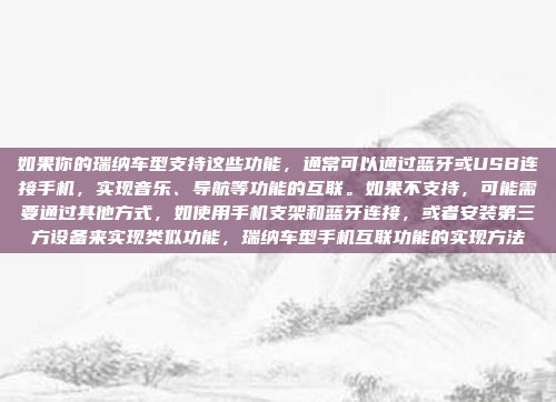 如果您的瑞纳车型支持车机互联功能,通常可以通过蓝牙或USB接口将手机与车辆连接,实现音乐播放、导航等操作,如果车辆不支持这些功能,可以通过手机支架和蓝牙连接,或安装第三方设备(如智能车机)来实现类似功能,从而提升驾驶体验。