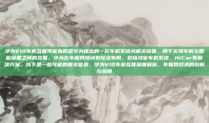 华为V10车机互联是华为推出的一款车机系统或相关设备,旨在实现车辆与智能设备之间的互联,该系统可能具备车辆与手机、平板等设备的无缝连接功能,为用户提供更智能化的驾驶体验,华为在车联网领域布局广泛,推出了鸿蒙车机系统和HiCar等解决方案,致力于将智能设备与车辆深度整合,提升用户的出行便利性和娱乐体验,华为V10车机互联作为其车联网生态的一部分,可能进一步推动智能驾驶和万物互联的发展,为用户带来更高效、更智能的用车体验。