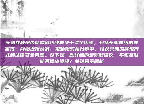 通过以上步骤,用户可以更好地了解和利用车机互联功能来播放视频,同时确保设备的兼容性和使用安全,如果在过程中遇到问题,可以参考车辆的用户手册或联系技术支持获取帮助。