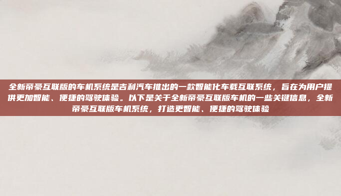 全新帝豪互联版的车机系统凭借其智能化、互联化和个性化的创新设计,为用户带来了更加便捷、安全和舒适的驾驶体验,无论是日常通勤还是长途旅行,这套系统都能为您的旅程增添更多乐趣,如果您对这款车感兴趣,欢迎深入了解其详细配置和功能,以满足您的个性化需求。