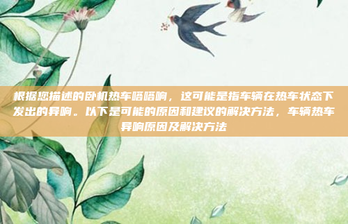 根据您描述的“卧机热车嗒嗒响”,这可能是指车辆在热车状态下发出的异响,以下是可能的原因和建议的解决方法:,1. **发动机内部异响**:可能是由于发动机内部零件磨损或松动导致的,建议检查发动机的连杆、气门挺柱、正时链条等部件。,2. **排气系统问题**:热车后排气系统温度升高,可能导致排气管或三元催化器因松动而发出异响,检查排气系统的固定支架是否松动或损坏。,3. **悬挂或转向系统松动**:悬挂或转向系统的部件在热车后可能会因温度变化而松动,导致异响,检查悬挂和转向系统的螺丝是否紧固。,4. **轮胎或刹车问题**:可能是轮胎老化或刹车片与轮毂摩擦导致的异响,检查轮胎表面是否有异常磨损,以及刹车片是否过度磨损。,5. **发电机或风扇皮带老化**:皮带在热车后可能会因膨胀或老化而发出异响,检查发电机或风扇皮带的磨损情况,必要时更换。,建议定期检查车辆的机械部件,确保所有螺丝和连接件紧固,避免因松动导致异响,如果问题持续存在,建议及时到专业维修店进行检查和修复。