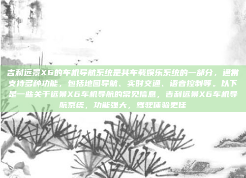 吉利远景X6的车机导航系统是其车载娱乐系统的重要组成部分,支持多种实用功能,包括地图导航、实时交通信息和语音控制等,该系统通常配备先进的导航软件,能够提供精准的地图显示和实时路径规划,帮助驾驶员轻松应对复杂路况,系统还支持语音交互功能,用户可以通过语音指令完成导航设置、信息查询等操作,提升驾驶便利性,部分车型还可能支持在线地图更新、多媒体娱乐、车辆信息显示等功能,进一步丰富了用户的使用体验,通过与手机或其他智能设备的连接,车机导航系统还能提供天气、新闻、语音助手等更多服务,为驾驶者带来智能化的出行体验。