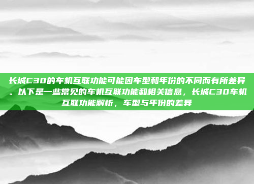 长城C30的车机互联功能因车型和年份的不同可能存在差异,常见的车机互联功能包括支持蓝牙连接、手机映射(如CarLife或CarPlay)、语音控制等,部分车型还可能配备原厂智能互联系统,提供更丰富的功能,不同年份和配置的车型在功能支持上可能会有所调整,建议用户查阅车辆使用手册或咨询4S店以获取准确信息。