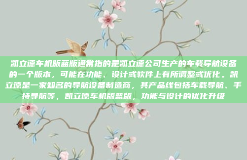 凯立德车机版蓝版是凯立德公司推出的一款车载导航设备,属于其产品线中的一种版本,可能在功能、设计或软件方面进行了优化或调整,凯立德作为知名的导航设备制造商,其产品涵盖车载导航和手持导航等多种类型,车机版蓝版以其精准的地图数据、丰富的功能和良好的用户体验受到广泛关注,适合需要高效导航和娱乐功能的车主。