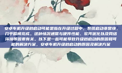 安卓车机升级秒启动可能是指在系统升级过程中,系统启动速度非常快,几乎瞬间完成,这种情况通常与硬件性能、软件优化以及网络环境等因素密切相关,硬件性能强大的设备(如高性能处理器和快速存储设备)能够显著提升升级速度,软件层面的优化,例如优化升级算法、减少不必要的启动程序以及精简升级包大小,也能有效缩短启动时间,网络环境的优化,如使用高速网络(如5G或稳定的Wi-Fi)和断点续传功能,也能进一步提升升级效率,为了确保升级顺利完成,建议在升级前确保设备电量充足、网络稳定,并备份重要数据,选择官方或经过验证的升级包,可以有效避免升级失败或系统不稳定的问题。