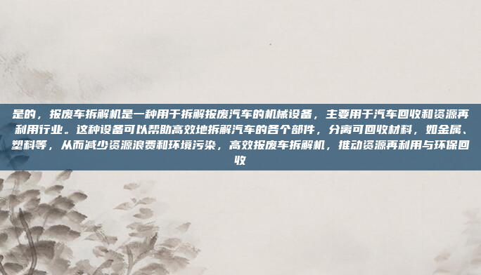 报废车拆解机是一种用于报废汽车拆解的机械设备,主要用于汽车回收和资源再利用行业,它能够高效拆解汽车的各个部件,分离出可回收材料如金属、塑料等,从而减少资源浪费和环境污染,这种设备在报废汽车处理中发挥着重要作用,不仅提高了拆解效率,还促进了资源的循环利用,有助于实现可持续发展目标。
