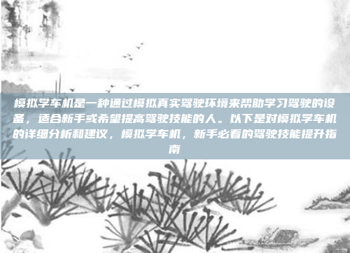 模拟学车机是一种通过模拟真实驾驶环境来帮助学习驾驶的设备,特别适合新手或希望提高驾驶技能的人群,它能够提供多种驾驶场景,包括基础操作训练、复杂道路模拟以及不同天气条件下的驾驶体验,帮助学习者在安全的环境中熟悉驾驶技巧,与传统实车训练相比,模拟学车机具有成本低、风险小的优势,同时支持个性化学习进度和即时反馈,有助于提升学习效率,对于希望快速掌握驾驶技能或强化驾驶技术的人来说,模拟学车机是一个值得考虑的选择,建议在选择时关注设备的模拟真实性和反馈机制,以确保最佳的学习效果。