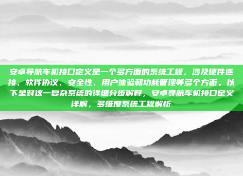 安卓导航车机接口定义是一个复杂的系统工程,涵盖了硬件连接、软件协议、安全性、用户体验和功耗管理等多个关键领域,硬件连接需要确保安卓设备与车载系统的物理接口兼容性,而软件协议则涉及通信协议和数据交互的标准,安全性是核心考量,必须防范潜在的网络安全威胁和数据泄露风险,用户体验方面,设计需注重易用性和人机交互的优化,以提升驾驶过程中的便利性,功耗管理也是重要环节,需平衡性能与能耗,确保设备在车载环境中的稳定运行,这一系统工程的实现需要多学科协作,以满足汽车智能化和用户需求的不断提升。