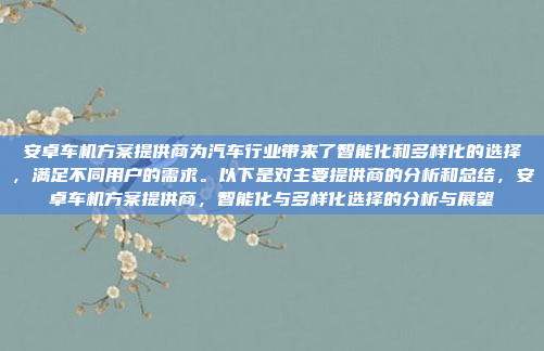 安卓车机方案提供商为汽车行业提供了智能化和多样化的解决方案,满足了不同用户对车载系统功能和性能的需求,这些方案不仅提升了车辆的智能化水平,还通过丰富的功能和灵活的配置,为用户带来更便捷、更个性化的驾驶体验,通过对主要提供商的分析和总结,可以看出其在技术创新、功能优化以及用户体验方面的显著优势,为汽车行业的发展注入了新的活力。