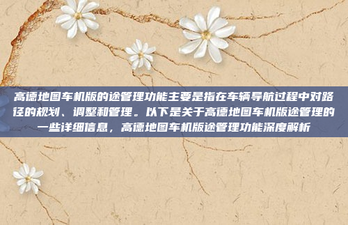 高德地图车机版的途管理功能是一项专为车辆导航设计的智能化路径规划和管理工具,该功能旨在帮助用户在行车过程中实现对路线的实时规划、动态调整和高效管理,通过整合实时路况、语音交互和智能算法,途管理功能能够为用户提供最优路径建议,避免拥堵路段,并在必要时快速重新规划路线,该功能还支持语音提示、路线标记和多路径对比等实用功能,进一步提升了导航的便捷性和准确性,高德地图车机版的途管理功能不仅优化了用户的驾驶体验,还通过智能化的路径管理帮助用户更高效地完成行程。