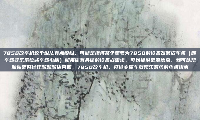 “7850改车机”这一说法较为模糊,可能指的是将型号为7850的设备改装为车机(车载娱乐系统或车载电脑),由于信息不明确,具体含义需要结合上下文或提供更多细节才能准确理解,如果你有具体的设备型号、改装需求或遇到的问题,可以提供更多相关信息,以便更好地帮助你解决问题,改装车机通常涉及硬件适配、软件设置或功能升级,建议在操作前确认设备兼容性并参考专业指导。