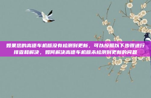 如果您的高德车机版未检测到更新,可以按照以下步骤进行排查和解决:检查网络连接是否正常,确保车机处于联网状态;尝试重启车机设备,重新登录高德账号;如果仍无法更新,可以手动进入设置,选择手动更新或清除缓存后重新下载;确认当前版本是否为最新版本,如果不是,尝试卸载后重新安装;如果以上方法均无效,建议联系高德客服寻求进一步帮助。