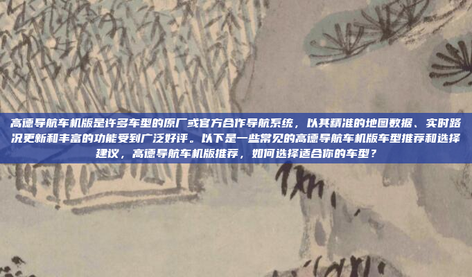 高德导航车机版是许多车型的原厂或官方合作导航系统,凭借其精准的地图数据、实时路况更新和丰富的功能,受到广泛好评,它为车主提供了高效、智能的导航体验,帮助用户轻松应对复杂路况,在选择适合的车型时,建议优先考虑与高德导航车机版兼容性好的车型,并根据个人需求评估功能是否满足日常使用,了解车辆品牌对高德导航的支持程度也很重要,以确保系统稳定性和售后服务,高德导航车机版为驾驶者提供了可靠、便捷的导航解决方案,是值得推荐的车载导航系统。