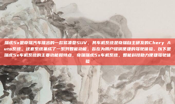 瑞虎5x的车机系统功能强大且全面,涵盖了智能语音控制、导航、娱乐、车联网、远程控制等多个领域,不仅显著提升了驾驶的便捷性,更为行车安全提供了有力保障,随着技术的不断进步,这套系统将持续优化升级,为用户带来更加智能化、个性化的用车体验,如果您对瑞虎5x的车机系统有更多具体问题,欢迎随时提问,我们将竭诚为您解答!