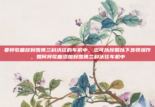 要将歌曲添加到雪佛兰科沃兹的车机系统中,您可以按照以下步骤操作:将存储有歌曲的USB设备插入车辆的USB端口,确保设备格式为FAT32以支持大多数文件类型,通过车载屏幕选择“USB”选项,浏览并选择要播放的歌曲或文件夹,如果您更喜欢无线连接,可以通过蓝牙将手机与车机配对,并将音乐从手机传输到车机,您还可以使用车载收音机应用,通过蓝牙或Wi-Fi将手机与车机连接,同步音乐库,如果需要,您还可以通过CD或MP3导入功能将音乐添加到车机中,这些方法均可帮助您轻松将歌曲添加到雪佛兰科沃兹的车机系统中,享受便捷的音乐播放体验。