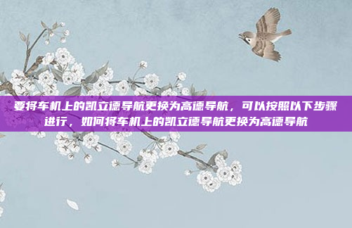 要将车机上的凯立德导航更换为高德导航,可以按照以下步骤进行:,1. **检查兼容性**:首先确认您的车机系统是否支持高德导航软件,不同车型的车机系统可能对导航软件有特定要求。,2. **下载高德导航**:访问高德导航的官方网站或应用商店,下载适用于车机的高德导航安装包。,3. **备份数据**:在进行操作前,建议备份车机上的重要数据,以防操作过程中出现意外。,4. **安装高德导航**:将下载好的高德导航安装包导入车机系统,按照提示完成安装过程。,5. **配置导航设置**:安装完成后,进入高德导航界面,根据提示完成初始设置,如地图更新、用户登录等。,6. **测试导航功能**:确保导航功能正常,包括地图显示、路径规划和语音提示等。,7. **恢复数据**:将之前备份的数据恢复到车机系统中。,8. **完成更换**:如果一切正常,导航更换完成,您可以正常使用高德导航。,如果在操作过程中遇到问题,建议联系车辆制造商或专业技术人员进行指导。