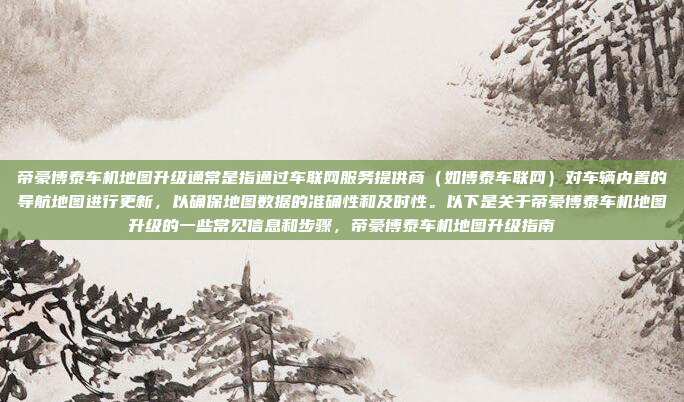 帝豪博泰车机地图升级是指通过车联网服务提供商(如博泰车联网)对车辆内置导航地图进行更新,以确保地图数据的准确性和及时性,升级通常通过车联网系统完成,用户需确保车辆处于良好的网络环境下,并按照提示操作,升级完成后,导航功能将更加精准,用户体验得到提升,需要注意的是,升级前应确保车辆电量充足,避免在行驶中进行操作,定期更新地图数据有助于保持导航的可靠性,建议用户关注官方通知,及时完成升级。