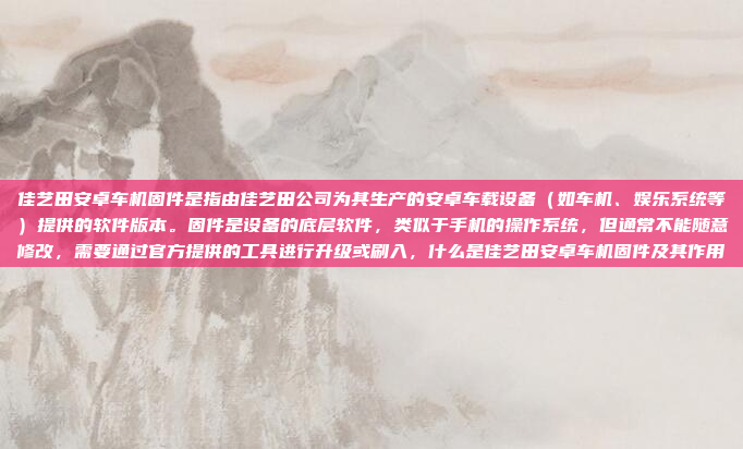 如果您有关于佳艺田安卓车机固件的具体问题,例如如何升级固件、如何刷写固件、固件版本信息等,欢迎提供更多详细信息,我会尽力为您解答,需要注意的是,刷写固件或修改设备软件可能会影响设备的正常运行,因此在操作前请务必仔细阅读官方说明文档或与官方技术支持团队取得联系,以确保操作的顺利进行。
