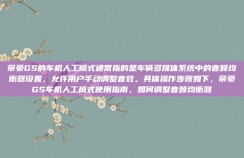 帝豪GS的车机人工模式是指车辆多媒体系统中的音频均衡器设置功能,允许用户手动调整音效,通过该功能,用户可以根据个人喜好或驾驶场景需求,调节低音、中音和高音等音频参数,以获得更个性化的听觉体验,具体操作步骤包括进入车辆多媒体菜单,选择音频设置,找到均衡器选项,然后手动调节各个频段的音量,这种模式为用户提供了更高的音效自定义空间,满足不同驾驶者对音响效果的多样化需求。