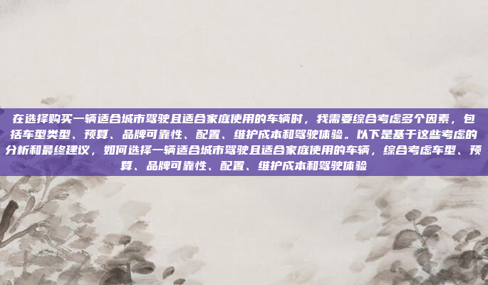 在选择适合城市驾驶且适合家庭使用的车辆时,需综合考虑多个关键因素,车型类型是核心,SUV因其宽敞空间和良好视野成为理想选择,而轿车则适合注重操控性和经济性的用户,预算范围直接影响可选车型,需在性能与价格之间找到平衡,品牌可靠性同样重要,选择口碑良好且维护成本低的品牌能减少长期支出,车辆配置方面,安全性和舒适性配置是重点,如气囊、ABS系统和空调系统等,维护成本和驾驶体验也需纳入考量,低油耗和舒适的驾乘感受能提升日常使用体验,综合以上因素,建议优先考虑空间宽敞、配置丰富且品牌可靠的SUV车型,以满足城市驾驶和家庭需求。