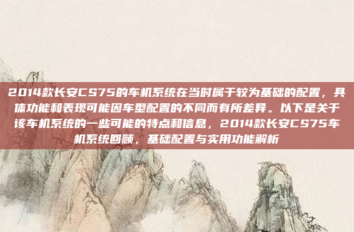 2014款长安CS75的车机系统在当时属于基础配置,功能和表现因车型配置的不同而有所差异,该车机系统可能配备了一些基础的娱乐功能,如收音机、蓝牙音乐播放以及简单的语音识别和导航功能,屏幕尺寸和界面设计可能较为基础,与现代车机相比在智能化和用户体验上有所不足,系统运行较为流畅,但在扩展性和兼容性方面较为有限,无法支持更多高级功能,总体而言,该车机系统在当时属于入门级配置,适合基本的驾驶需求,但在智能化和科技感方面表现较为一般。