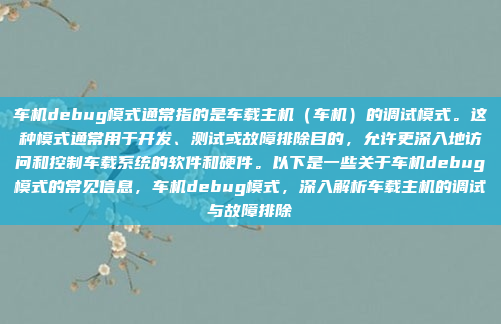 - 车机调试模式主要用于车辆电子系统和车载设备的开发、测试和故障排除,能够帮助专业人员深入分析系统运行状态。
