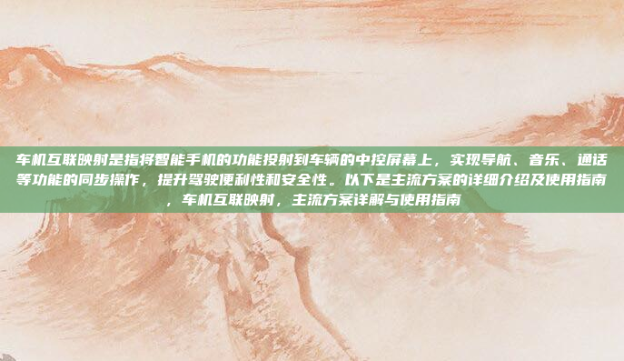 ** ,车机互联映射是一种将智能手机功能投射到车辆中控屏的技术,实现导航、音乐、通话等操作的同步控制,既提升驾驶便利性,又增强行车安全性,目前主流方案包括苹果CarPlay、百度CarLife、华为HiCar等,均通过有线或无线连接方式实现,CarPlay支持iOS设备,提供简洁的界面和Siri语音控制;CarLife兼容安卓与iOS,功能全面;HiCar则深度整合华为生态,支持多设备协同,使用前需确保车机系统兼容,并通过USB或蓝牙完成连接,部分车型还支持无线投屏,进一步简化操作流程,这一技术正逐渐成为智能汽车的标配,为用户带来更高效、安全的驾驶体验。