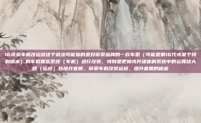 “16帝豪车机改运放”这一说法可能指的是对帝豪品牌旗下某款车型(可能是第16代或某个特别版本)的车载娱乐系统(车机)进行改装,尤其是对音响系统中的运算放大器(运放)进行升级或更换,这种改装的主要目的是提升车辆的音质表现,通过优化音频信号的处理和放大,使音响系统能够提供更清晰、更细腻的声音效果,改装过程中,可能需要选择更高性能的运放芯片,并结合其他音响部件的调整,以达到最佳的音效提升效果,这种改装对于追求高品质音响体验的车主来说,具有一定的吸引力。