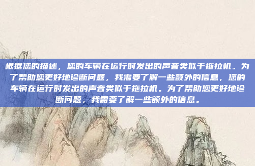 您的车辆在运行时发出的声音类似于拖拉机,这可能表明存在机械问题,为了更好地诊断问题,我需要了解一些额外的信息,例如您的车辆类型(汽油车或柴油车)、声音出现的具体情况(如加速时、怠速时或行驶时)、是否有其他异常现象(如振动、排放异常等),以及车辆的使用情况和维护历史,这些信息将有助于更准确地判断问题的根源,并提供相应的解决方案,建议您尽快联系专业的维修人员进行检查,以确保车辆的安全和性能。