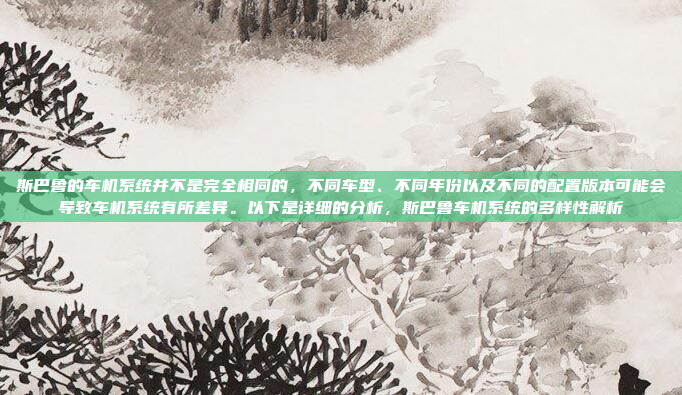 斯巴鲁的车机系统并非完全一致,其差异主要由车型、生产年份和配置版本的不同所致,不同车型可能配备不同版本的车机系统,而同一车型在不同年份或配置版本中也可能存在系统差异,这些差异可能导致功能、界面设计或兼容性方面的区别,在使用或升级车机系统时,需注意车辆的具体型号和配置,以确保兼容性和功能的完整性。
