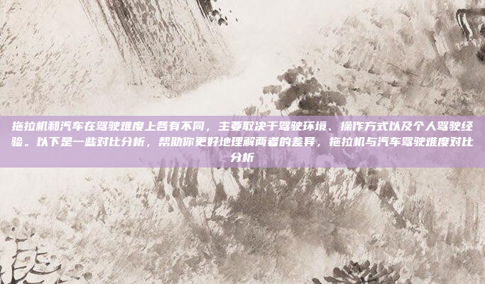 拖拉机和汽车在驾驶难度上存在显著差异,主要受驾驶环境、操作方式和驾驶经验的影响,拖拉机通常用于田间作业,对操控性和稳定性要求较高,且其驾驶视野和操作方式与传统汽车不同,需要适应较低的速度和复杂的地形,相比之下,汽车的驾驶环境相对标准化,操作系统更为统一,适合城市和高速公路等场景,个人驾驶经验也会影响对两者驾驶难度的感受,但总体而言,拖拉机的驾驶需要更高的专注力和适应能力,而汽车则更注重稳定性和速度控制,通过对比分析,可以更好地理解两者的差异,从而选择适合的驾驶方式。