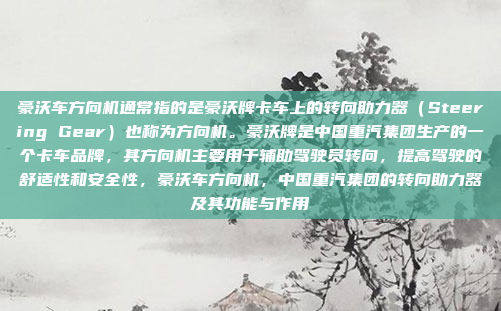 豪沃车方向机是指豪沃牌卡车上的转向助力器(Steering Gear),主要用于辅助驾驶员转向,提高驾驶的舒适性和安全性,豪沃牌是中国重汽集团生产的一个卡车品牌,其方向机作为关键部件,通过提供助力使驾驶员更轻松地控制车辆转向,豪沃方向机性能可靠,能够适应各种复杂路况,为驾驶员带来更安全、舒适的驾驶体验。