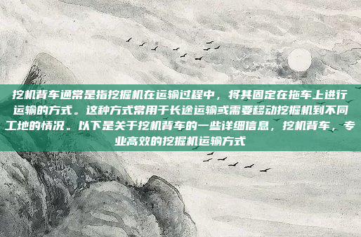 挖机背车是一种常见的挖掘机运输方式,指将挖掘机固定在拖车上进行运输,这种方式适用于长途运输或需要将挖掘机转移至不同工地的场景,在运输过程中,挖掘机通常通过专业的固定装置安装在拖车上,以确保运输过程中的安全性和稳定性,为了确保运输安全,操作人员需要对挖掘机进行全面检查,包括设备状态、固定情况以及拖车的承载能力等,选择专业的运输团队和符合法规的运输设备也是确保运输顺利的关键,挖机背车因其高效性和经济性,成为工程领域常用的运输方式之一。