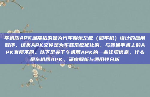 车机版APK是专为车载娱乐系统设计的应用程序,具有优化的界面设计、更高的安全系数以及专为车载环境打造的功能,用户可以通过汽车厂商的官方应用商店或正规第三方平台获取,在使用过程中,建议优先选择官方渠道,确保软件的安全性和兼容性,以获得最佳的使用体验。