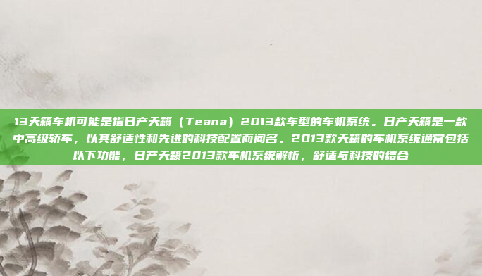 如果您对2013款天籁的车机系统有具体问题,或需要了解如何进行系统升级、功能扩展或故障修复,欢迎提供更多细节信息,我将竭诚为您解答。