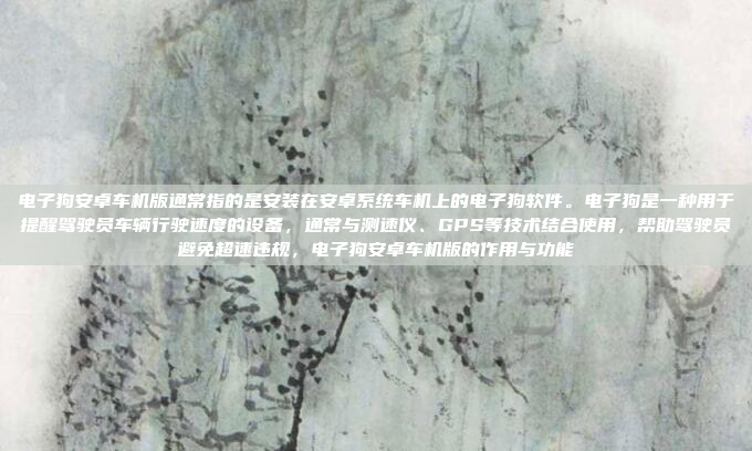 电子狗安卓车机版是一种安装在安卓系统车机上的软件,主要用于提醒驾驶员车辆行驶速度,帮助避免超速违规,它结合了测速仪和GPS等技术,通过实时监测和计算车速,向驾驶员发出提醒,这种设备不仅提升了驾驶安全性,还能有效减少交通违规的风险,为驾驶员提供智能化的辅助驾驶功能。