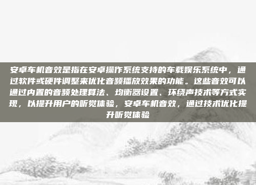 安卓车机音效是指在安卓操作系统支持的车载娱乐系统中,通过软件或硬件调整来优化音频播放效果的功能,这些音效通过内置的音频处理算法、均衡器设置、环绕声技术等方式实现,旨在提升用户的听觉体验,安卓车机音效能够根据不同的音乐类型、驾驶环境或用户偏好,提供个性化的音频优化方案,使声音更加清晰、立体和富有层次感,通过这些技术手段,安卓车机音效不仅提升了车载娱乐系统的性能,还为用户带来了更优质的听觉享受。