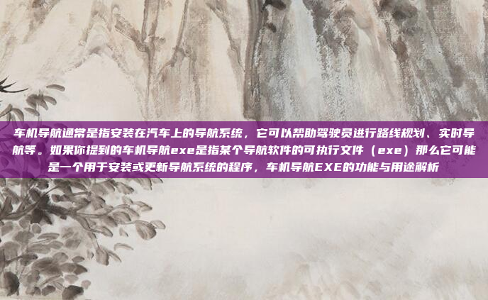 车机导航是一种安装在汽车上的导航系统,主要用于帮助驾驶员进行路线规划和实时导航,如果提到的“车机导航.exe”是指某个导航软件的可执行文件,那么它很可能是一个用于安装或更新导航系统的程序,该程序通常用于将导航系统安装到汽车中,或者用于更新现有的导航软件以获取最新的地图数据和功能,通过这个.exe文件,用户可以方便地完成导航系统的安装或更新,从而确保导航功能的准确性和实用性。