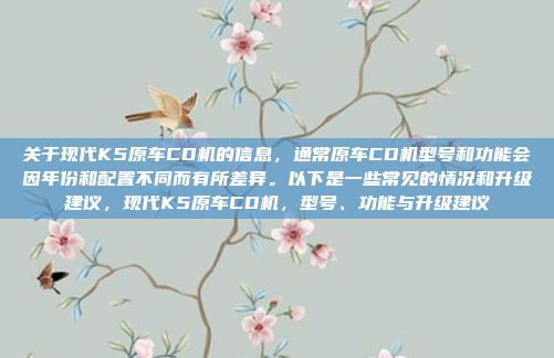 现代K5原车CD机的型号和功能因年份和配置不同而有所差异,为了提升音质或功能,车主可以考虑升级CD机,常见的升级方法包括安装更高品质的 aftermarket headunits 或者使用支持蓝牙连接的设备,以实现更好的音乐播放和手机互联功能,升级时需注意保留原车的 wiring harness 和接口,以确保兼容性和安全性,建议选择专业安装服务,以避免因操作不当导致的损坏。