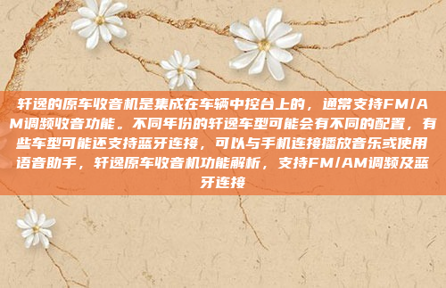 日产轩逸的原车收音机集成在车辆中控台,通常支持FM/AM调频功能,为驾乘者提供基础的广播收听需求,不同年份的轩逸车型在配置上可能存在差异,部分车型还支持蓝牙连接功能,可与手机设备配对,实现音乐播放或语音助手的使用,进一步提升了车内娱乐体验。
