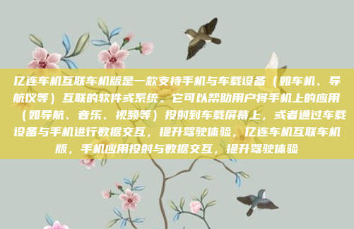 亿连车机互联车机版是一款专为手机与车载设备(如车机、导航仪等)设计的互联软件或系统,它支持将手机上的应用(如导航、音乐、视频等)投射到车载屏幕上,或通过车载设备与手机进行数据交互,从而提升驾驶体验,该系统旨在让用户在驾驶过程中更方便地使用手机功能,同时增强娱乐和导航体验,为驾驶者提供更安全、更便捷的行车环境。