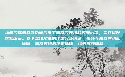 福特的车机互联功能通过提供丰富的连接和控制选项,显著提升了驾驶体验,该功能支持多种连接方式,包括蓝牙连接、Wi-Fi热点以及手机应用远程控制,使用户能够轻松实现与车辆的无缝互动,通过语音控制、触控屏幕或手机应用,用户可以便捷地操作娱乐系统、导航、车辆设置等功能,车机互联功能还支持智能家居集成,允许用户在车内远程控制家中设备,进一步拓展了智能化的使用场景,这些功能不仅提升了驾驶的便利性,还增强了车辆的安全性和智能化水平,为用户带来更高效、更舒适的驾驶体验。