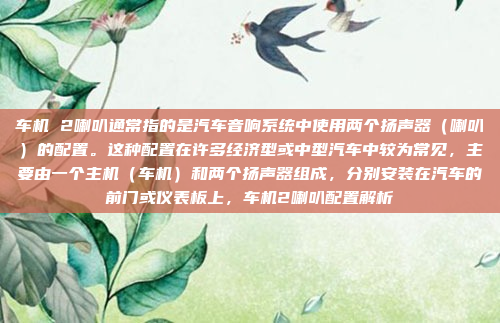 车机2喇叭是指汽车音响系统中采用两个扬声器的配置,常见于经济型或中型汽车,这种配置通常由主机(车机)和两个扬声器组成,分别安装在汽车的前门或仪表板上,能够提供基础的音响效果,满足日常听音需求,尽管音质和功能相对基础,但其简单的设计和较低的成本使其成为许多车型的标配选择。