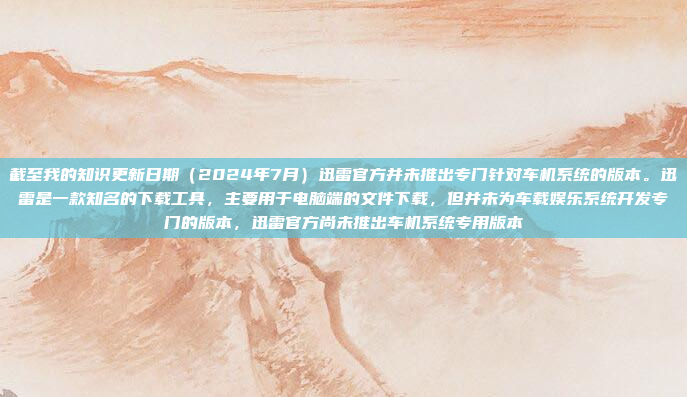 截至2024年7月,迅雷官方尚未推出专门针对车机系统的版本,迅雷是一款知名的下载工具,主要用于电脑端的文件下载,但并未为车载娱乐系统开发专门的版本,迅雷的主要功能集中在个人电脑领域,专注于提升文件下载速度和效率,而并未扩展至车载娱乐系统的适配,车机用户无法直接使用迅雷进行文件下载或其他相关操作。