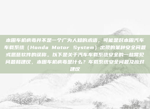 本田车机病毒并不是一个广为人知的术语,可能是对本田汽车车载系统(Honda Motor System)出现的安全问题或恶意软件的误称,随着汽车智能化的发展,车载系统的安全性逐渐成为关注的焦点,以下是关于汽车车载系统安全的一些常见问题和建议: ,1. **什么是本田车机病毒?** , 本田车机病毒可能是指本田汽车的车载系统中出现的漏洞或恶意软件,可能导致系统故障、数据泄露或远程控制等风险。 ,2. **常见问题** , - 车载系统可能因软件漏洞被攻击。 , - 恶意软件可能通过无线更新或外部设备进入系统。 , - 驾驶者可能面临隐私泄露或车辆控制风险。 ,3. **建议** , - 定期更新车载系统以修复漏洞。 , - 避免使用未经验证的外部设备或软件。 , - 关注官方发布的安全公告。 ,4. **重要性** , 车载系统的安全性直接关系到车辆的正常运行和驾驶者的安全,需引起高度重视。