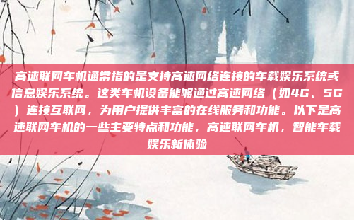 高速联网车机是一种支持高速网络连接的车载娱乐或信息娱乐系统,通过4G、5G等高速网络为用户提供丰富的在线服务和功能,这类设备能够实现车辆与互联网的实时连接,支持在线导航、多媒体娱乐、车辆状态监控、远程控制等多种功能,高速联网车机的主要特点包括快速的数据传输速度、智能化的系统操作以及与多种智能设备的无缝连接,它还能够通过OTA(空中下载技术)进行软件更新,不断提升用户体验,随着5G网络的普及,高速联网车机的功能和性能将进一步提升,为用户带来更智能、更便捷的驾驶体验。