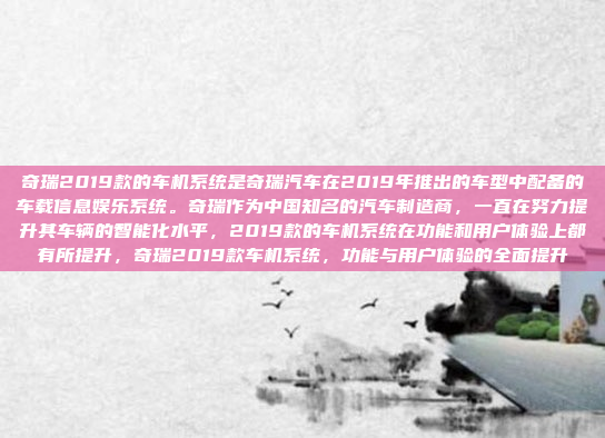 奇瑞2019款的车机系统是奇瑞汽车在2019年推出的车型中配备的车载信息娱乐系统,作为中国知名的汽车制造商,奇瑞一直致力于提升车辆的智能化水平,2019款车机系统在功能和用户体验方面均有显著提升,进一步展现了奇瑞在汽车智能化领域的努力和成果。