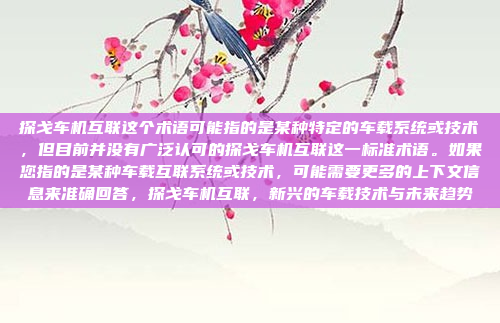 “探戈车机互联”这一术语可能指某种特定的车载系统或技术,但目前并未被广泛认可为标准术语,如果您指的是某种车载互联系统或技术,可能需要更多的上下文信息来准确理解其具体含义,该术语可能与车载娱乐系统、车辆与外部设备的连接技术或智能驾驶辅助系统相关,但缺乏统一的定义和标准,如果您能提供更多背景信息,可能会有助于更准确地解释这一概念。
