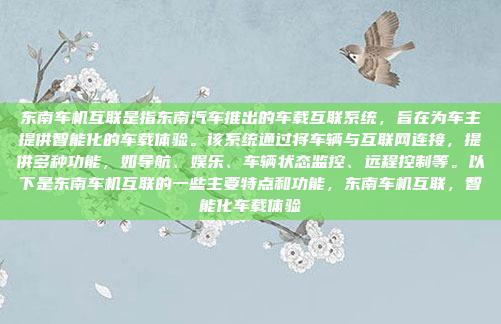 东南车机互联系统通过与手机或其他智能设备的无缝连接,为用户打造智能化、个性化的驾驶体验,系统不仅具备强大的智能交互功能,还通过持续的技术创新,为用户带来更安全、更便捷的出行方式,如果您对具体车型或功能有更多疑问,欢迎随时咨询东南汽车官方渠道,获取专业解答。