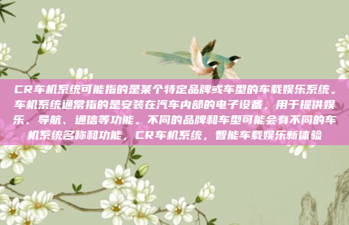 CR车机系统可能指的是某个特定品牌或车型的车载娱乐系统,车机系统通常指的是安装在汽车内部的电子设备,用于提供娱乐、导航、通信等功能,不同的品牌和车型可能会有不同的车机系统名称和功能,CR车机系统可能具备多媒体娱乐、卫星导航、蓝牙连接、语音控制等常见功能,同时可能还支持车辆状态监控、安全辅助驾驶等高级功能,由于不同品牌和车型的车机系统在软硬件配置、功能设计以及用户体验上可能存在差异,因此CR车机系统的具体功能和性能需要根据实际车型和品牌来确定,车机系统是提升驾驶体验的重要组成部分,为驾驶员和乘客提供了丰富的功能和便利性。